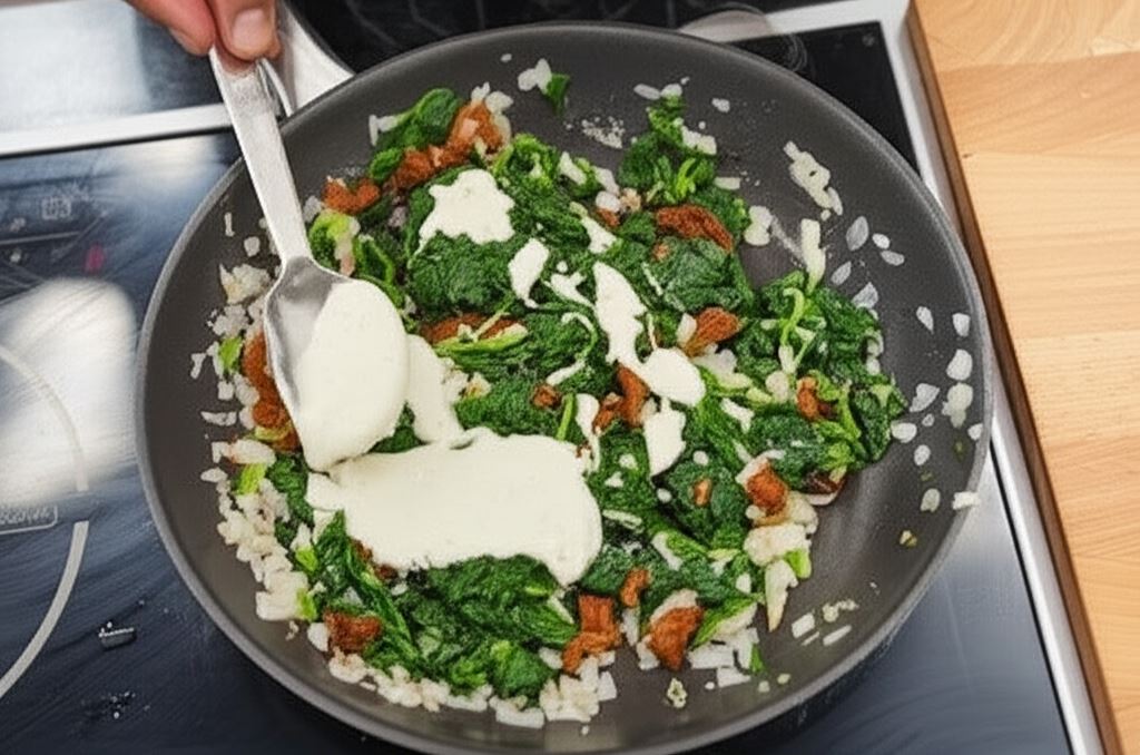Całość smaż moment, następnie połącz śmietanę z fixem Knorr i otrzymany w ten sposób kremowy sos wlej do szpinaku.