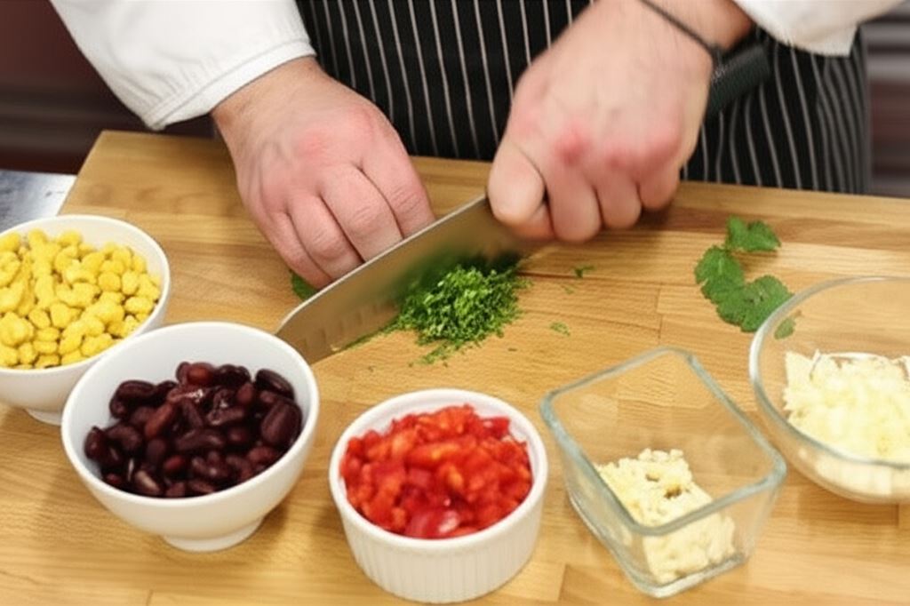 Czerwoną paprykę i cebulę pokrój w kostkę, posiekaj natkę kolendry i czosnek, przepłucz fasolę oraz kukurydzę.
