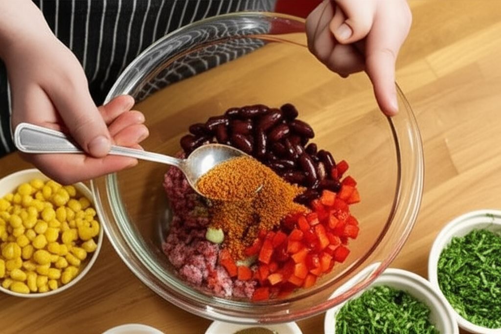 W tym czasie mięso z cebulą przypraw resztą przypraw (zmielonymi nasionami kolendry, kminem rzymskim), Przyprawą do mięs Knorr, wsyp połowę posiekanej natki kolendry, fasolę, paprykę i kukurydzę. Farsz starannie wymieszaj.