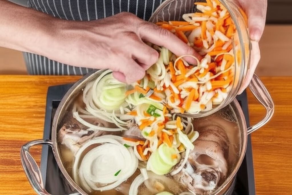 Przy końcu gotowania wsyp włoszczyznę i cebulę. Gotuj dodatkowo przez 20min