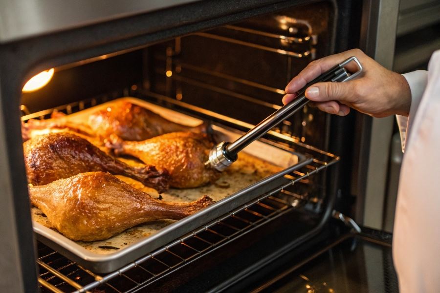 Jeśli nie posiadasz termometru, wykonaj test widelcem – po nakłuciu najgrubszej części udka wypływający sok powinien być przezroczysty, bez śladów krwi.