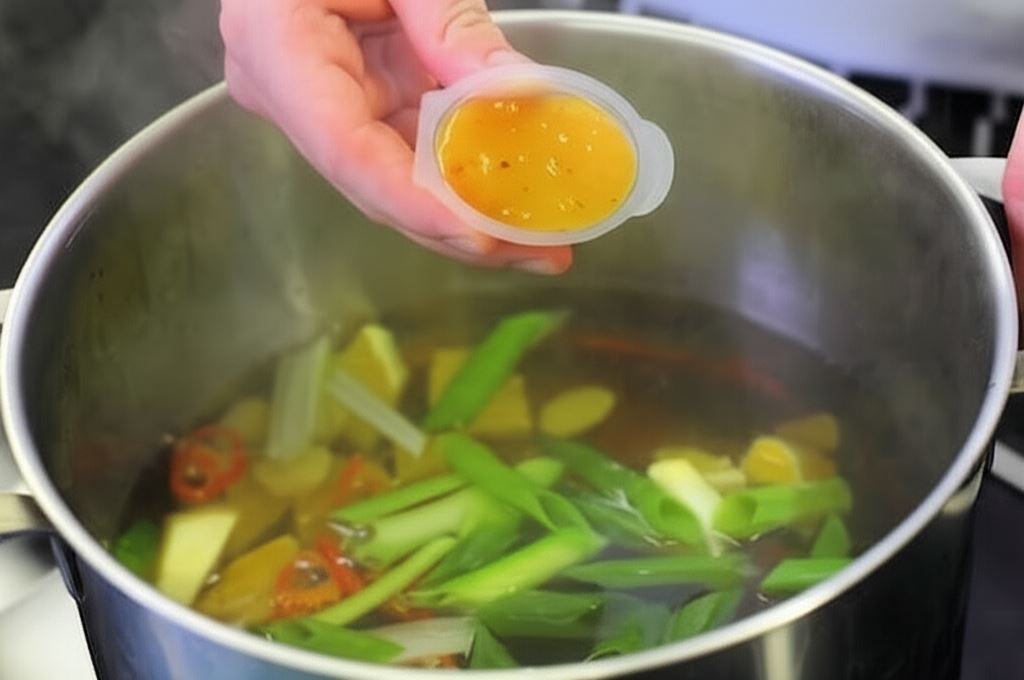 Wszelkie składniki, z wyjątkiem kurczaka, umieść w dużym rondlu, dolej wodę i wsyp Bulionetkę drobiową Knorr. Doprowadź do wrzenia ciągle mieszając.