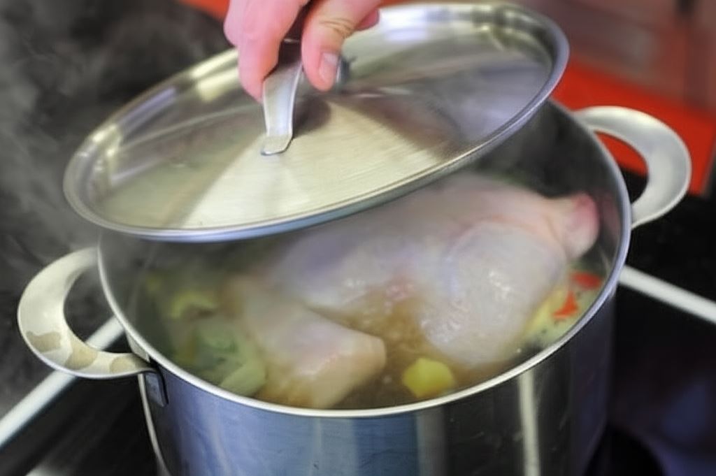 Kurczaka umieść piersią do dołu i zredukuj ogień. Gotuj powoli przez 30 minut pod pokrywką. Po upływie tego czasu obróć kurczaka i gotuj jeszcze przez 15 minut. Potem zdejmij rondel z palnika i pozostaw nakryty na 30 minut.