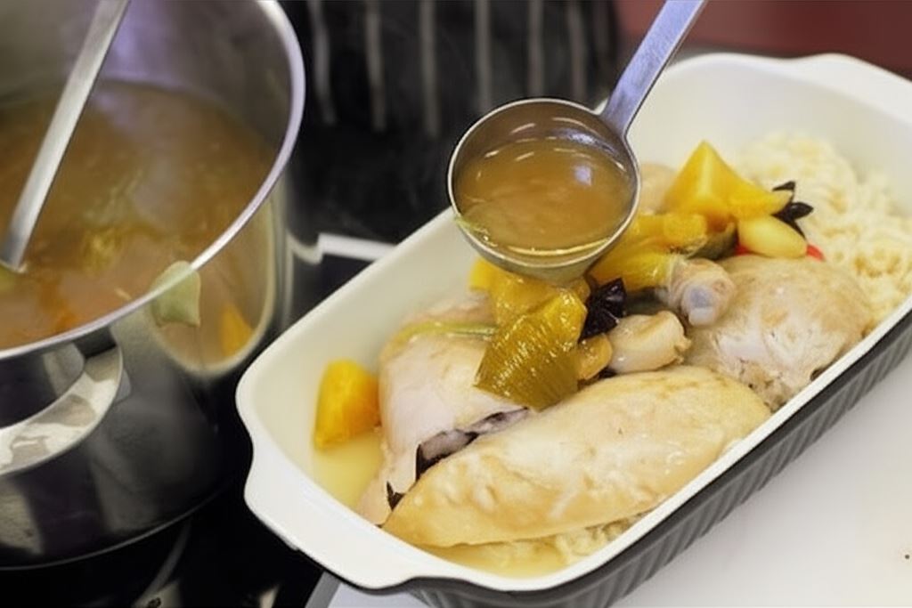 Delikatne mięso kurczaka zanurzone w orientalnej zalewie to prawdziwa uczta dla zmysłów. Nasz gotowany kurczak z imbirem to danie, w którym mięso nabiera aksamitnej konsystencji i przesiąka aromatami goździków, anyżu i pomarańczy. Sekret tkwi w powolnym gotowaniu i starannie dobranej kompozycji składników, które nadają potrawie wyjątkowy charakter.