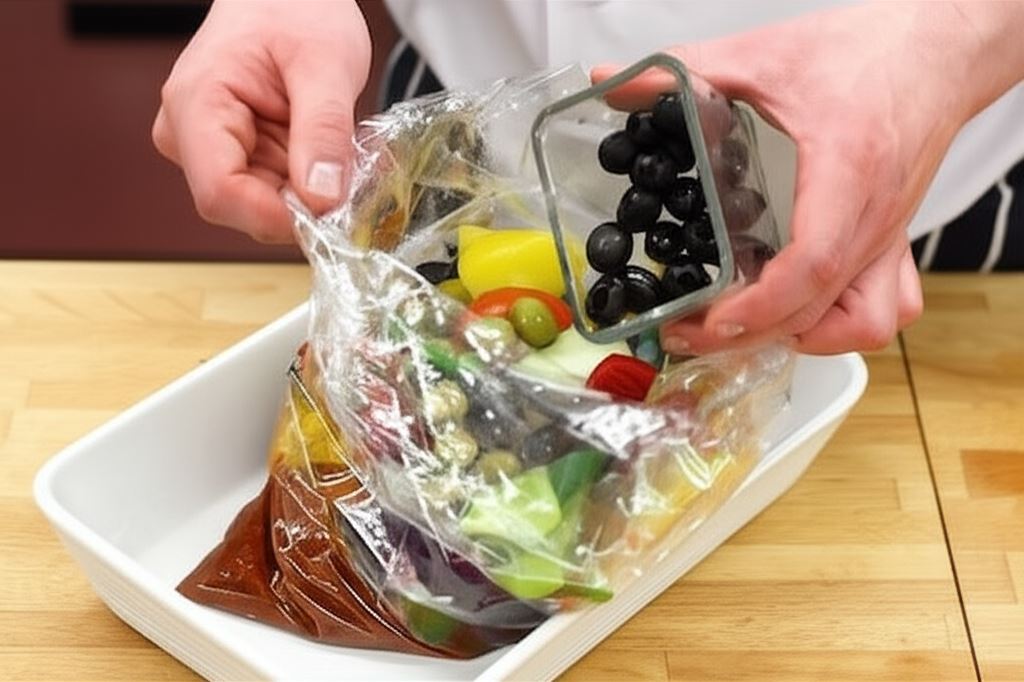 Papryki, bakłażana i cebulę potnij na drobniejsze kawałki. Połącz z oliwkami i wsyp do woreczka zawierającego mięso. Dorzuć też pomidory pocięte na ćwiartki.
