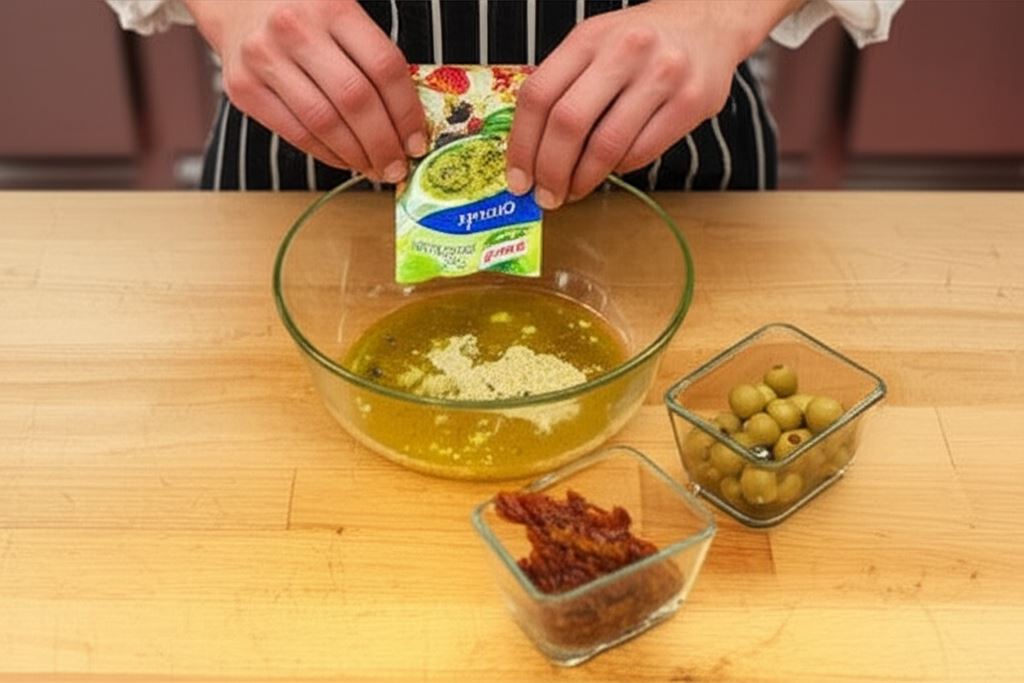 Zawartość paczki Knorr połącz z oliwą, wodą oraz przeciśniętym przez praskę czosnkiem.