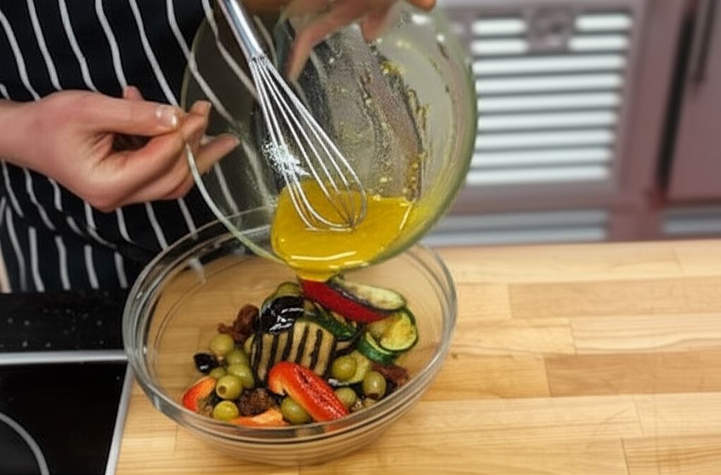 W obszernej misce połącz razem wszystkie składniki: bakłażana, cukinię, paprykę, pomidory i oliwki oraz sos. Sałatkę umieść na półmisku.