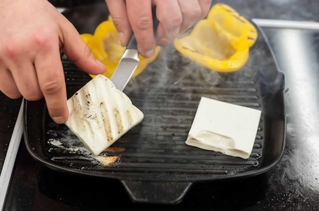 Paprykę przetnij na połowę, usuń gniazdo, skrop oliwą i upiecz na grillu. Ser pokrój na grube plastry i także zgrilluj z obu stron.