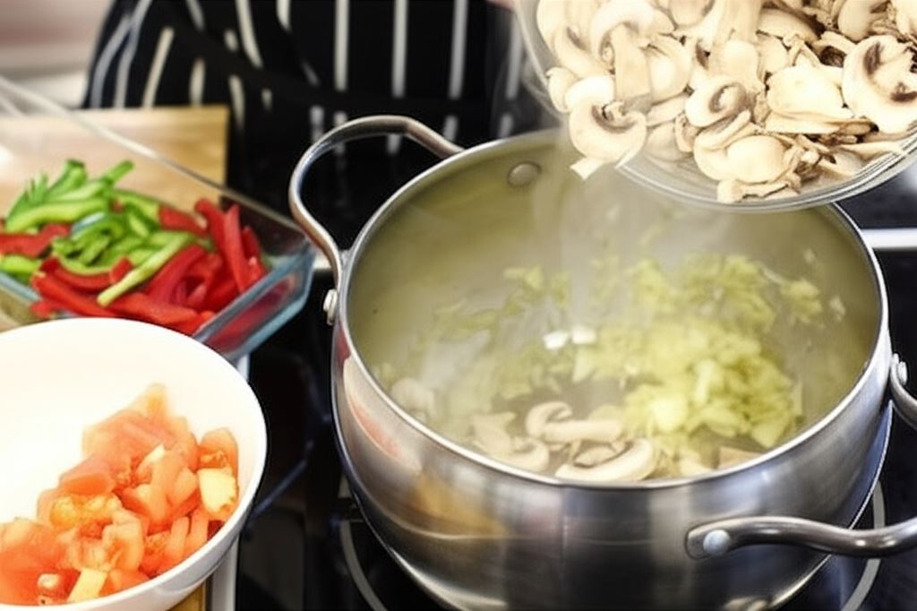 Rozgrzej olej na patelni, zrumień cebulę z pieczarkami, przenieś do rondla i wsyp paprykę pokrojoną w paski oraz pomidory pokrojone w kostkę.