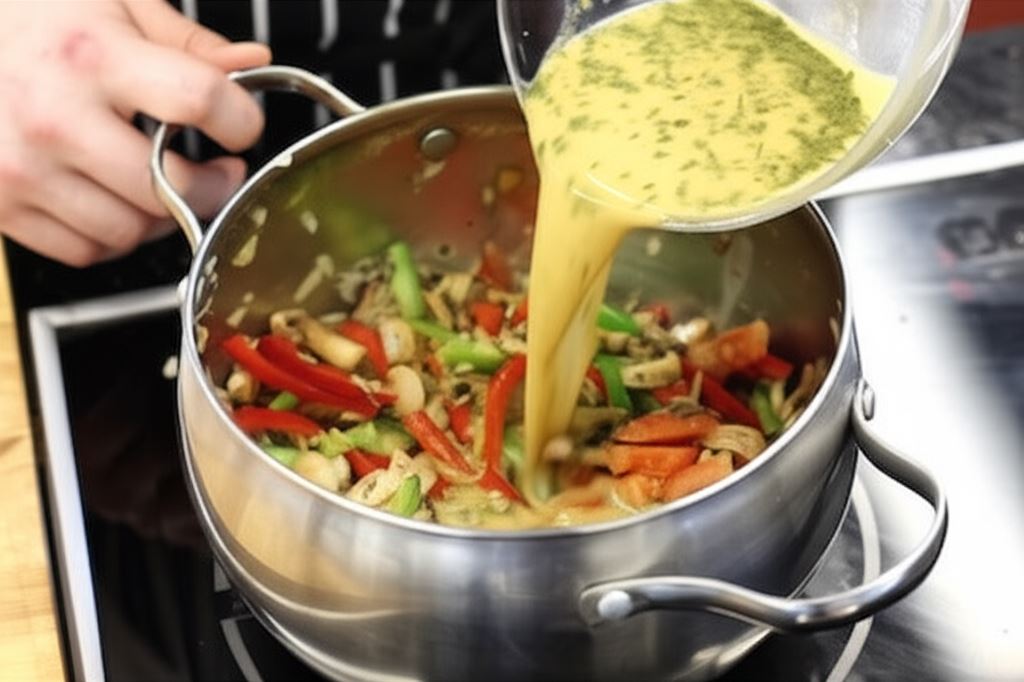Przygotowany sos przelej do rondla zawierającego warzywa i duś na małym ogniu aż warzywa zmiękną, od czasu do czasu mieszając.