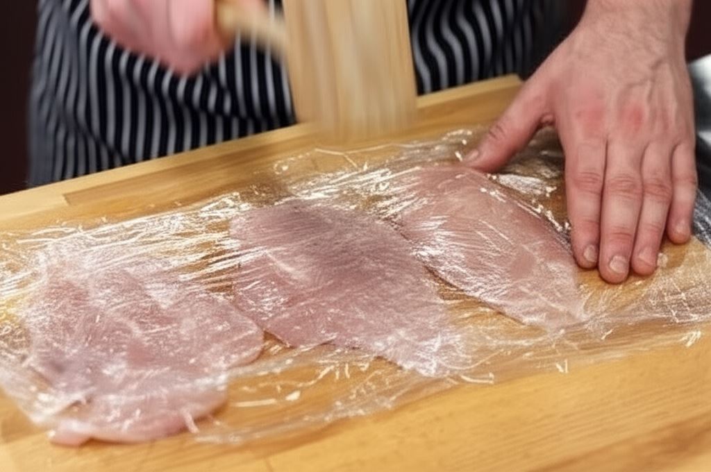 Przekrój piersi kurczaka wzdłużnie na połowę. Potem delikatnie rozbij je przez folię, aby mięso miało podobną grubość na całej długości.
