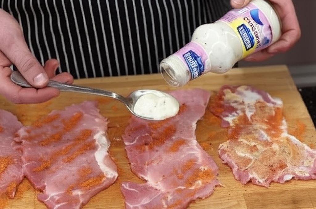 Kotlety rozbij na cienko, posyp przyprawą Knorr i pokryj z jednej strony sosem Hellmann's Czosnkowym. Dodaj majeranku.
