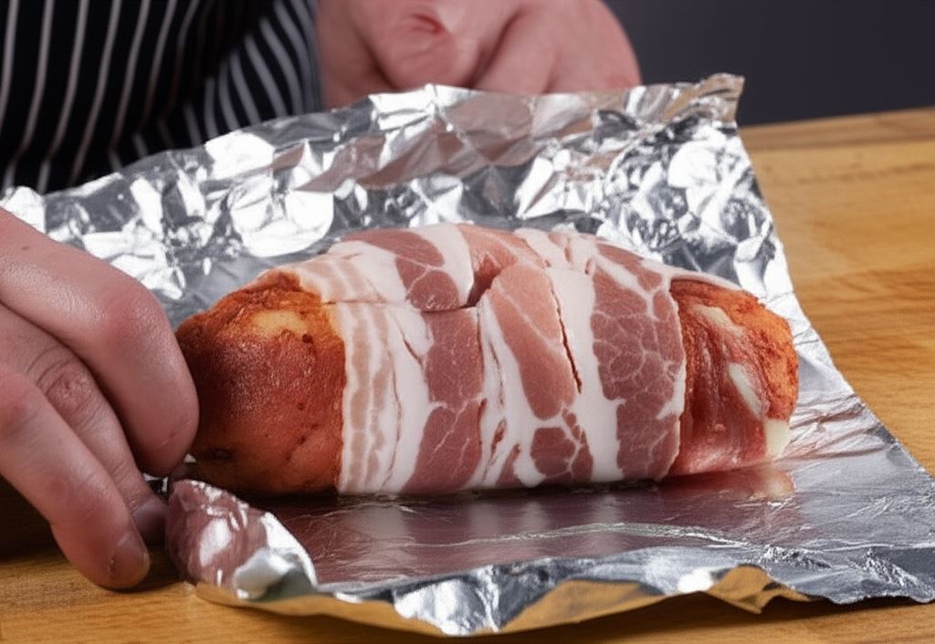 Roladki umieść na trzech plastrach boczku, po czym owiń je boczkiem. Potem każdą roladkę zawiń w kawałek folii aluminiowej posmarowanej oliwą.