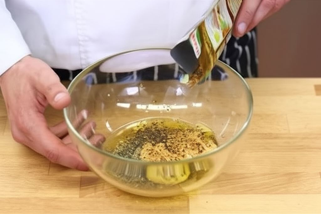 W miseczce połącz przyprawę Knorr z musztardą, majerankiem i oliwą.