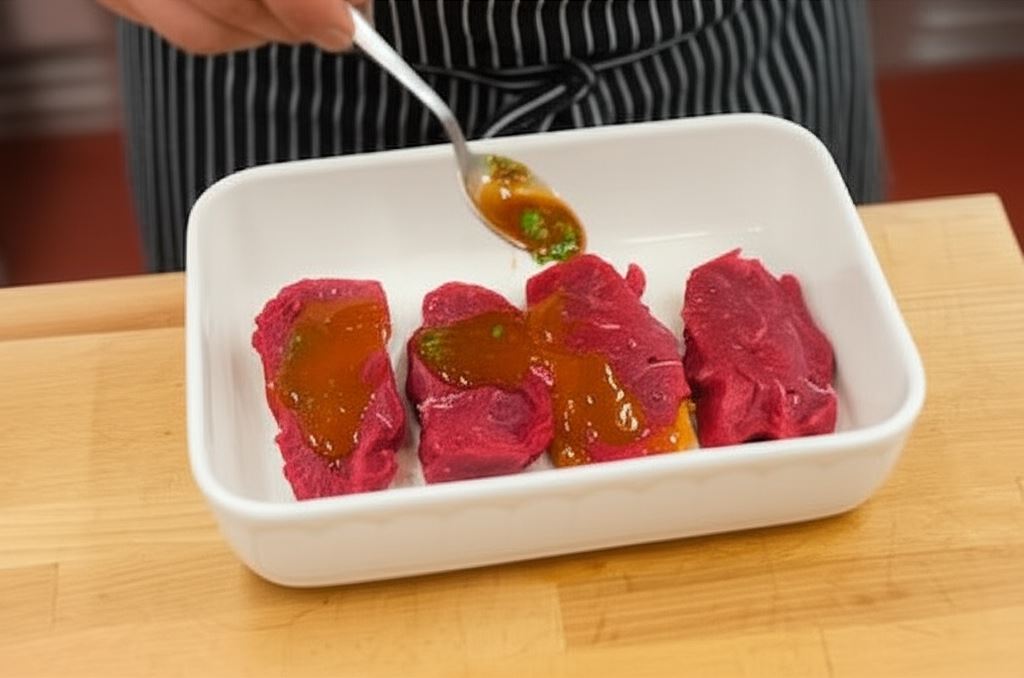 Przygotowaną marynatą natrzyj dokładnie steki wołowe i odłóż je na 30 minut do chłodnego miejsca.