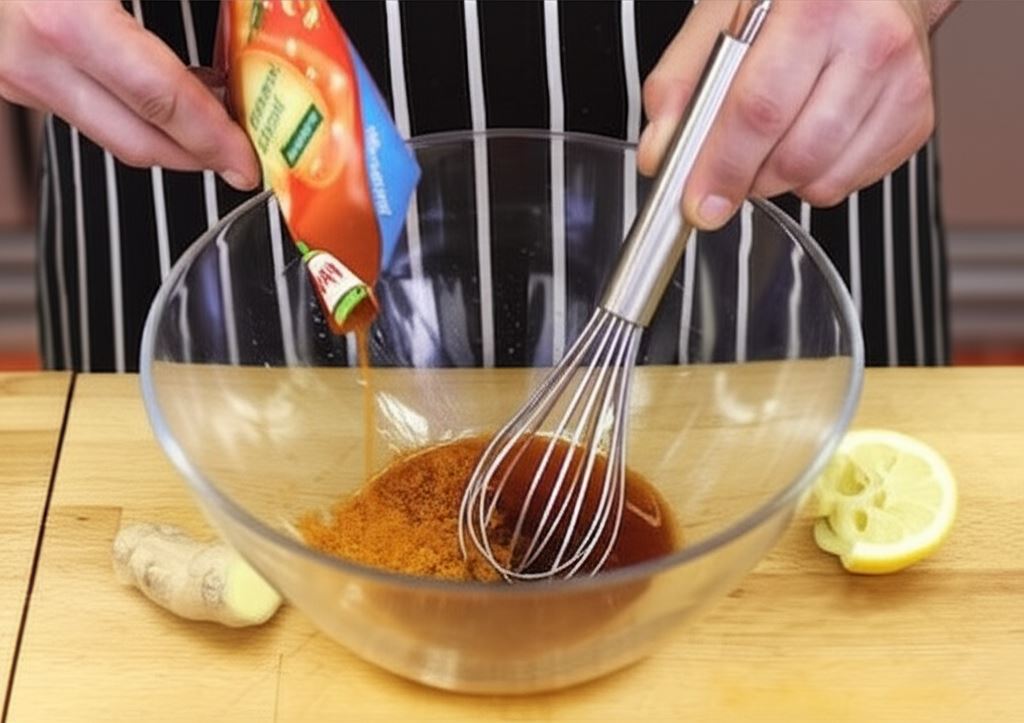 W obszernej misce wymieszaj starty imbir, sok z cytryny, sos sojowy, miód, przyprawę do kurczaka Knorr oraz ostrą paprykę.