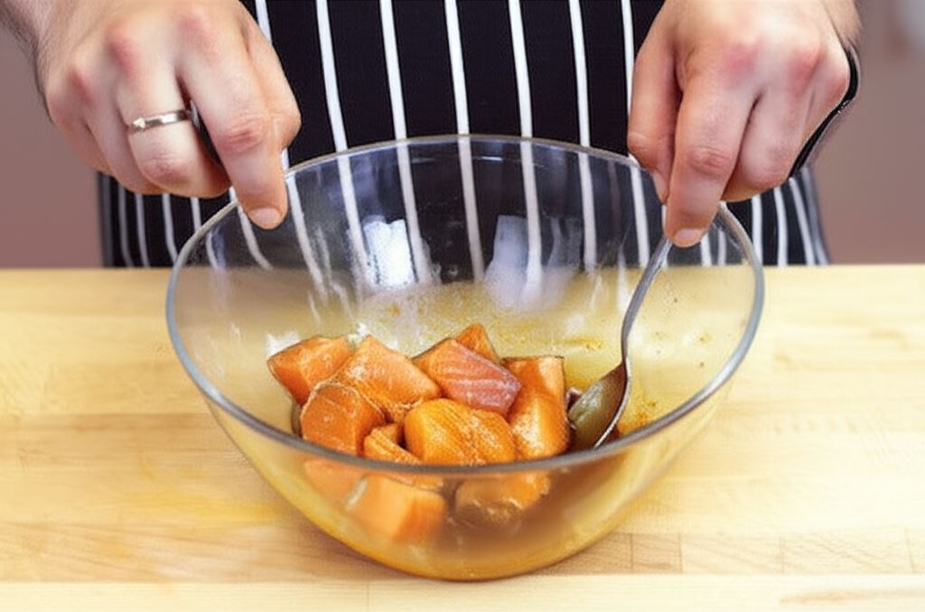 Rybę pokrój w kostkę o boku 2 cm i umieść na 30 minut w przygotowanej marynacie.