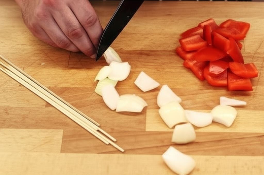 Potnij paprykę i cebulę na kawałki o wielkości 2 cm. Przygotuj szaszłyki, nabijając na patyczki naprzemiennie kawałki ryby, papryki oraz cebuli.