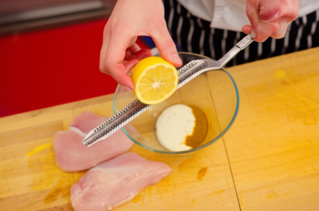 Sos z jogurtu połącz z curry oraz startą skórką cytrynową i sokiem cytrynowym.