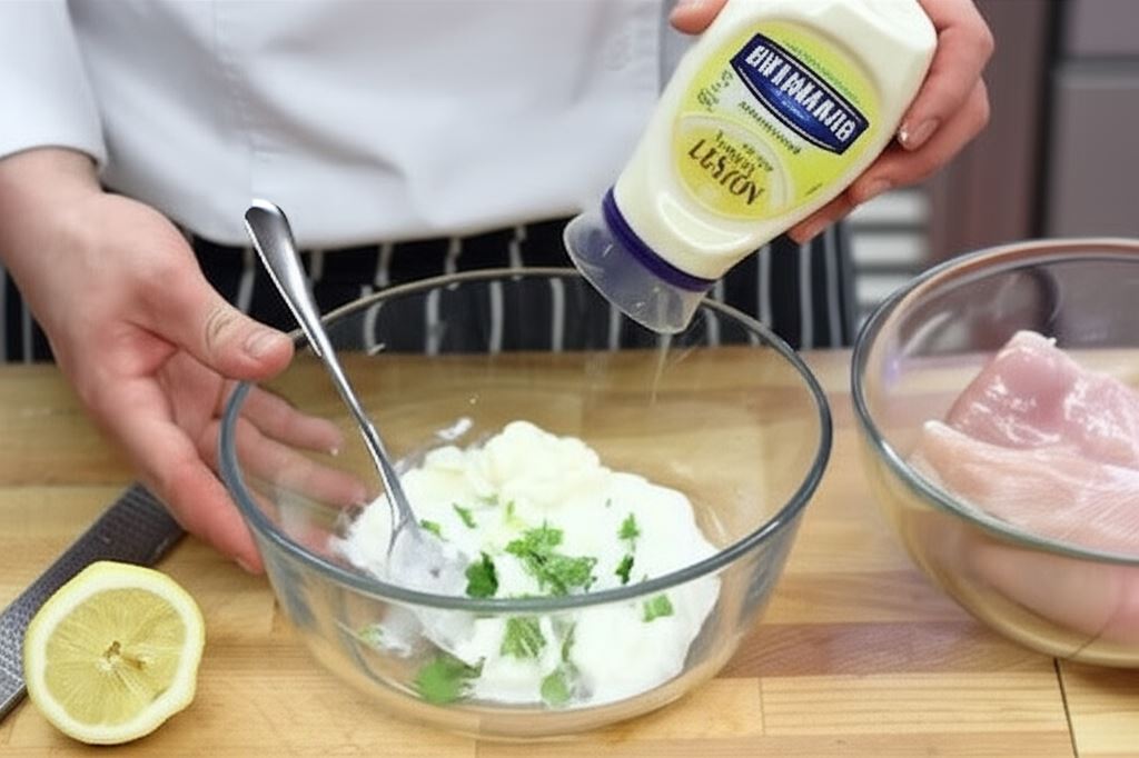 Połącz majonez z jogurtem, posiekanymi ziołami i startą skórką cytrynową. W takiej marynacie zanurz mięso i pozostaw na minimum jedną godzinę.