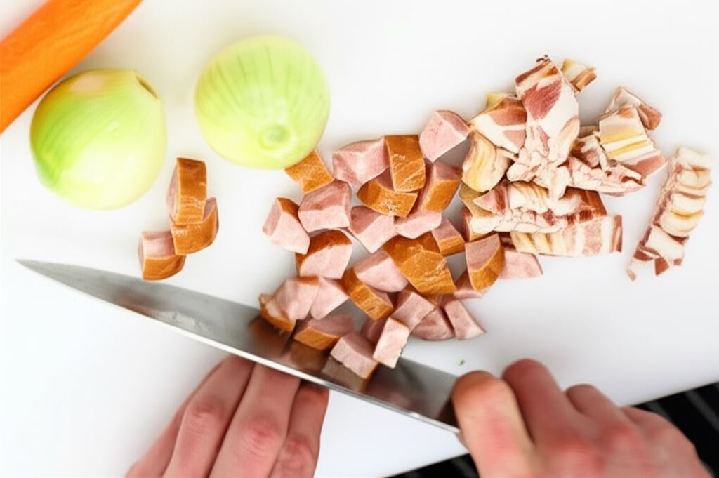 Pokrój boczek i kiełbasę w kostki, cebulę posiekaj, marchewkę obierz i pokrój w kostki.