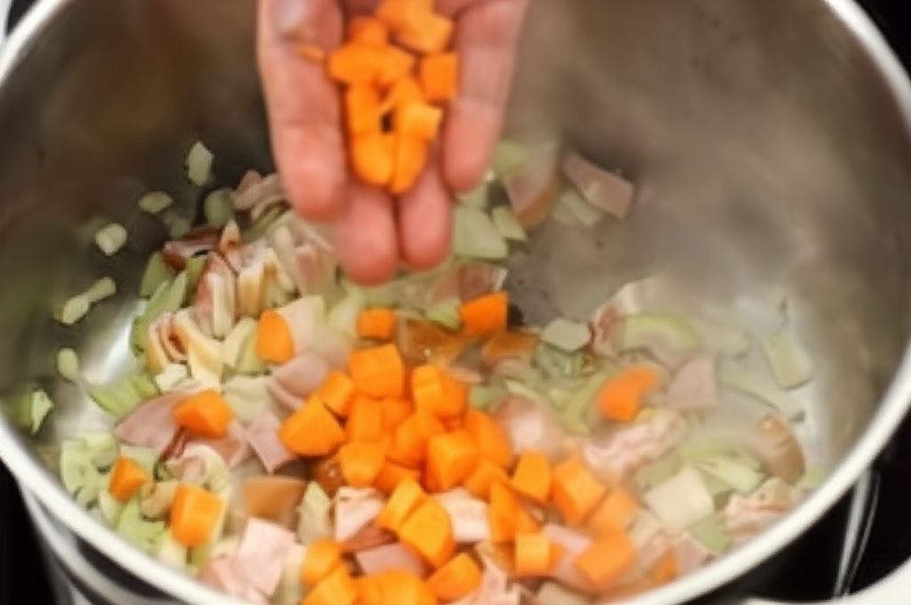 Boczek podsmażaj w dużym garnku, dorzuć kiełbasę, cebulę i marchew, smaż aż cebula się zezłoci, następnie całość zalej wodą.