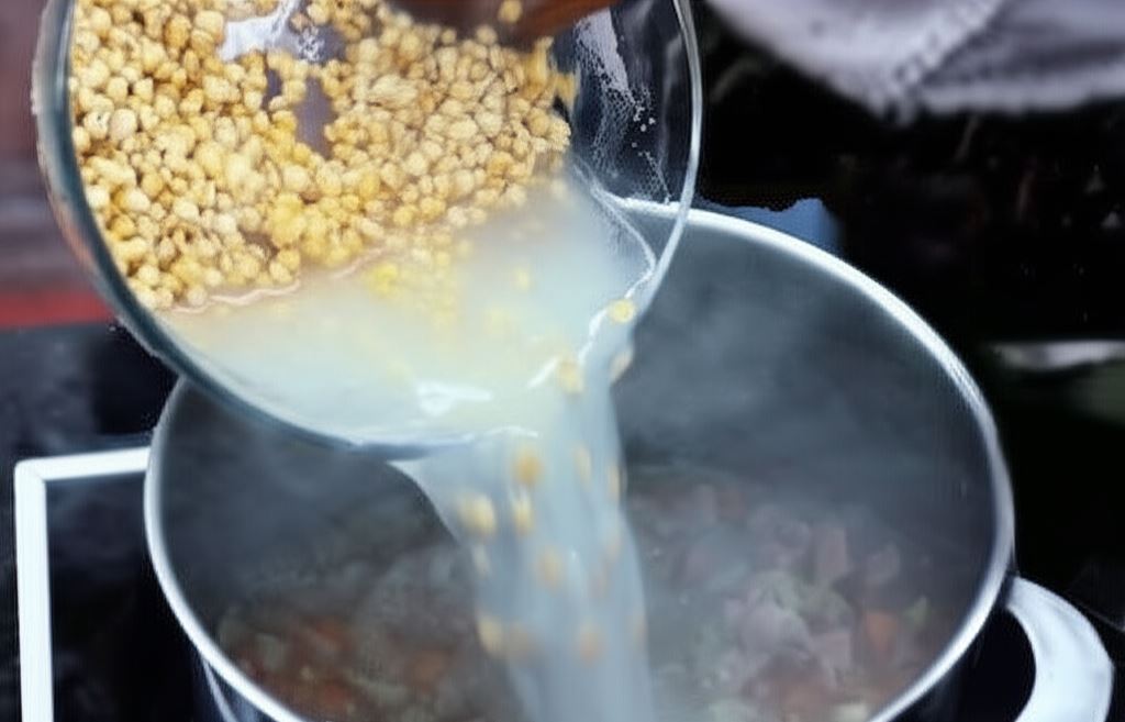 Wsyp groch razem z wodą z namaczania i posiekany czosnek.