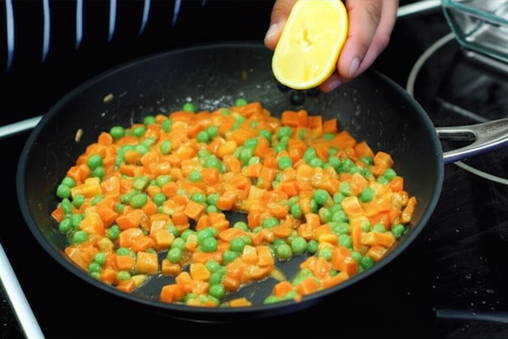 Możesz przygotować to danie zarówno ze świeżych, jak i mrożonych warzyw – efekt będzie równie smaczny! Sekret wyjątkowego smaku tkwi w dodaniu soku z cytryny, który subtelnie podkreśla naturalną słodycz marchewki i groszku, nadając całości orzeźwiający charakter.