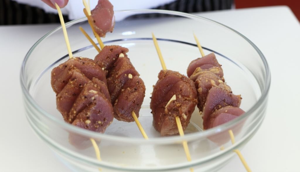 Porcje mięsa ponabijaj na długie patyczki lub metalowe szpikulce.