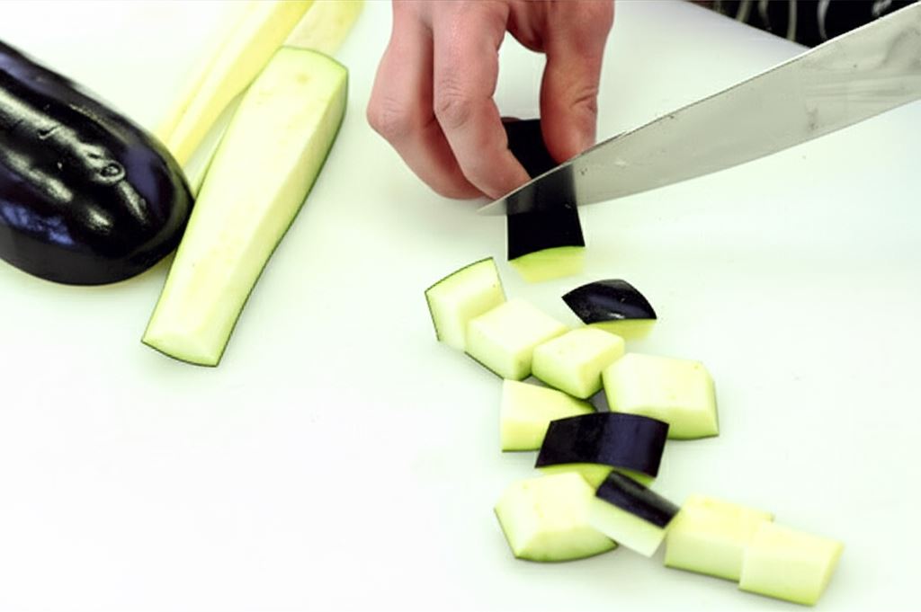 Bakłażana pokrój w grube kostki. Posyp solą i odstaw na 15 minut. Potem odciśnij wydzielony sok. Bakłażany przepłucz pod zimną, bieżącą wodą, usuwając jednocześnie nadmiar soli.
