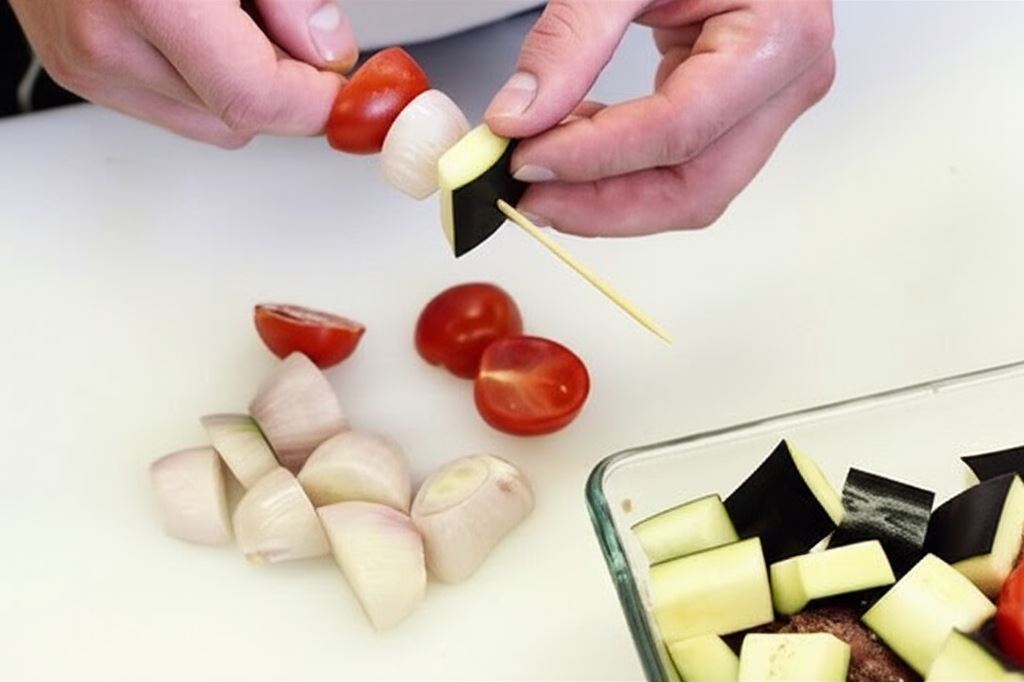 Pomidorki przekrój na połówki. Nabijaj na szpadki naprzemiennie raz bakłażana, raz cebulkę, raz pomidorka. Powtórz tę sekwencję kilkakrotnie.