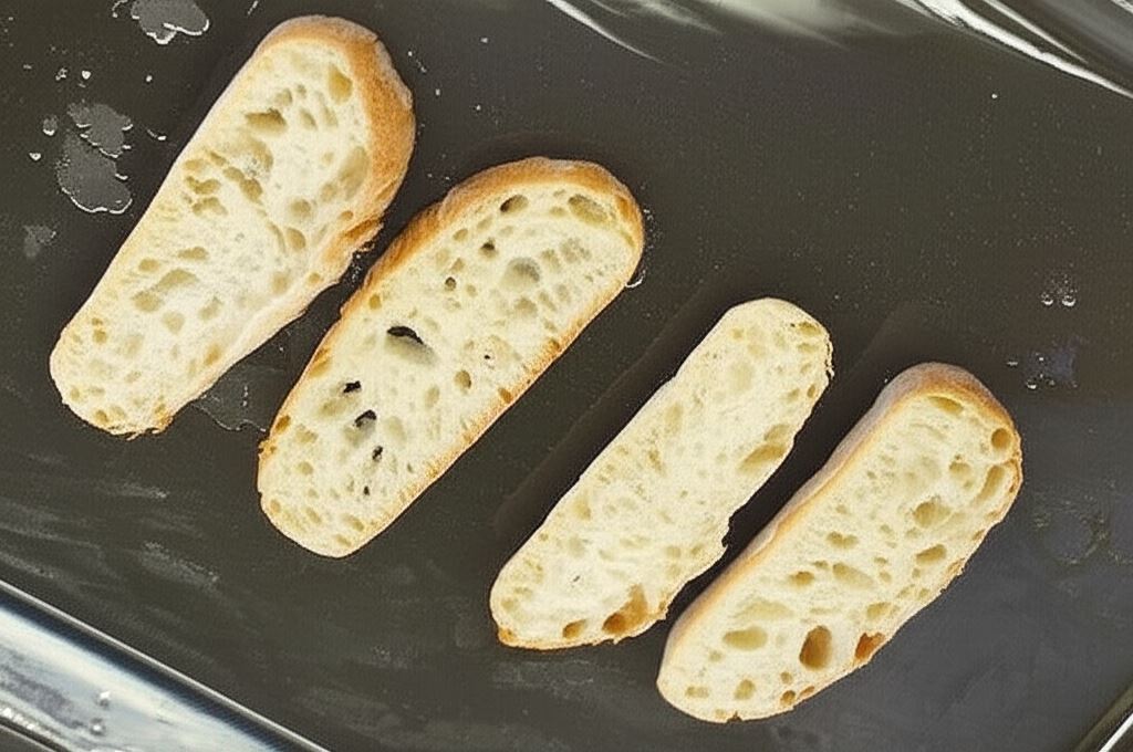 Na natłuszczonej blasze umieść bułkę pokrojoną na cienkie plasterki.