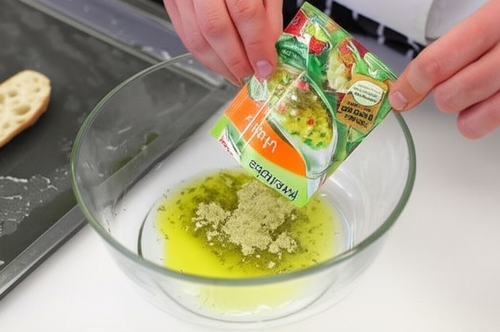 Sos sałatkowy Knorr połącz z resztą oliwy. Przygotowanym w ten sposób sosem posmaruj grzanki. Umieść w rozgrzanym do 180 stopni piekarniku na 10 minut.