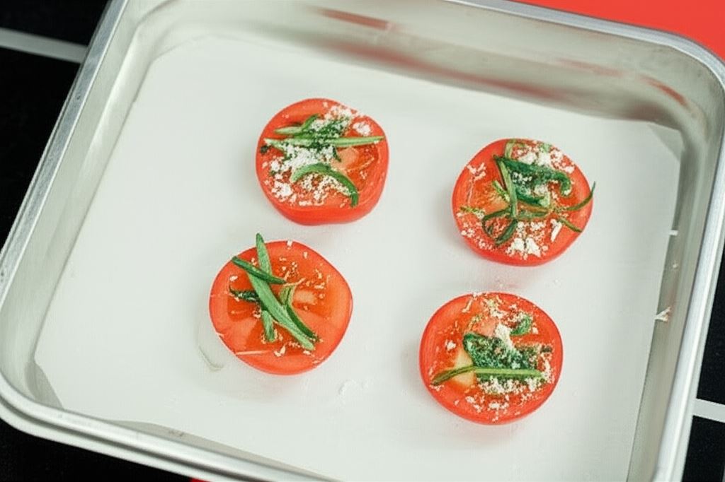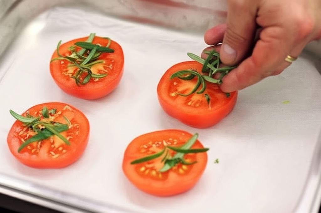 Dojrzałe, mięsiste pomidory przekrój na pół, umieść na pergaminie, posyp listkami tymianku i rozmarynu.