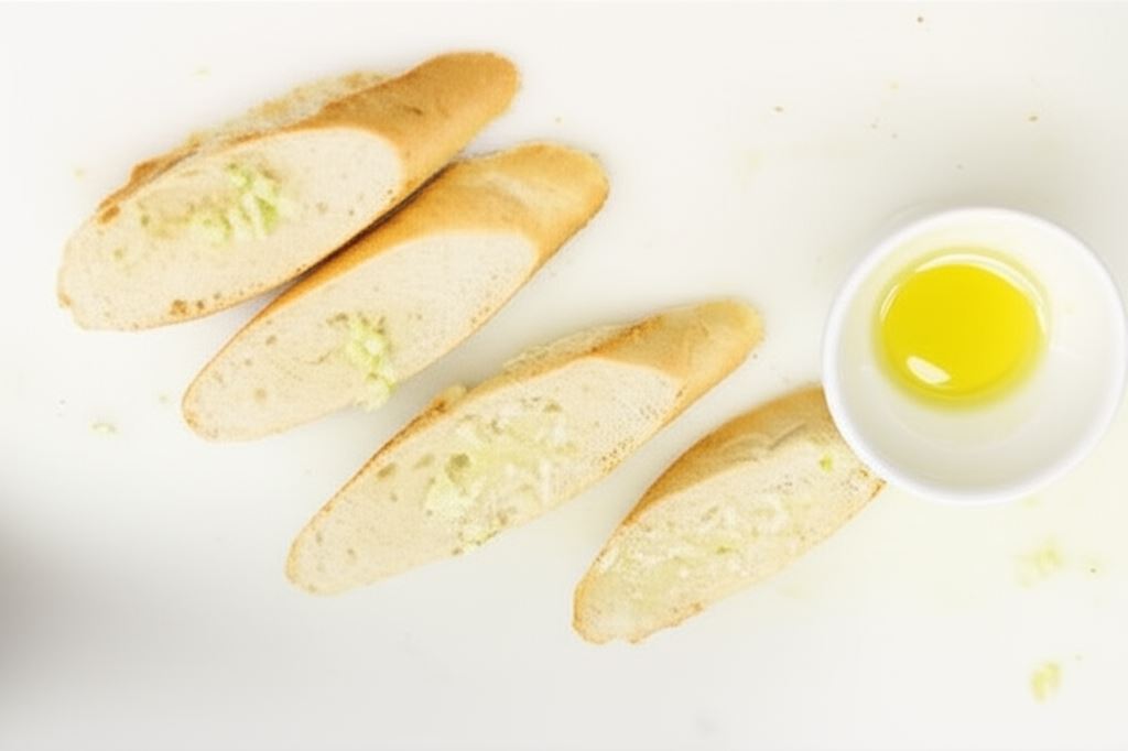 Kawałki bułki paryskiej skrop oliwą, przetrzyj czosnkiem i umieść plaster koziego sera.