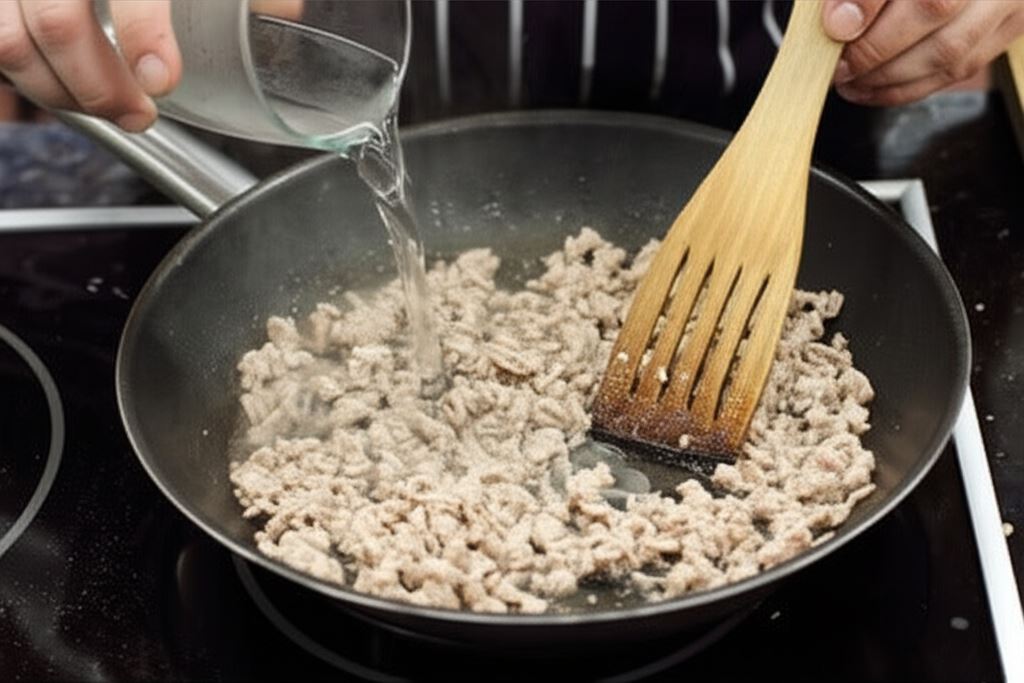 Przyrumień mięso na rozgrzanym oleju aż zbrązowieje i stanie się sypkie. Wlej 250 mililitrów wody, doprowadź do wrzenia i dodaj zawartość torebki Fix Spaghetti Bolognese Knorr, następnie starannie wymieszaj.
