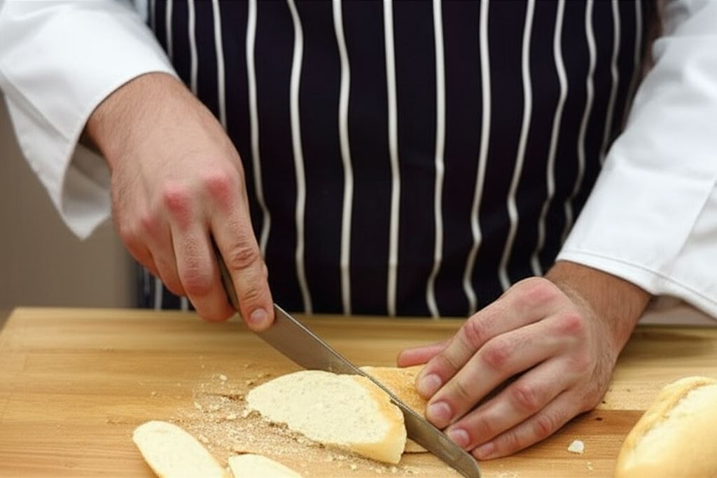 Pokrój bagietkę skośnie na niewielkie kromeczki.