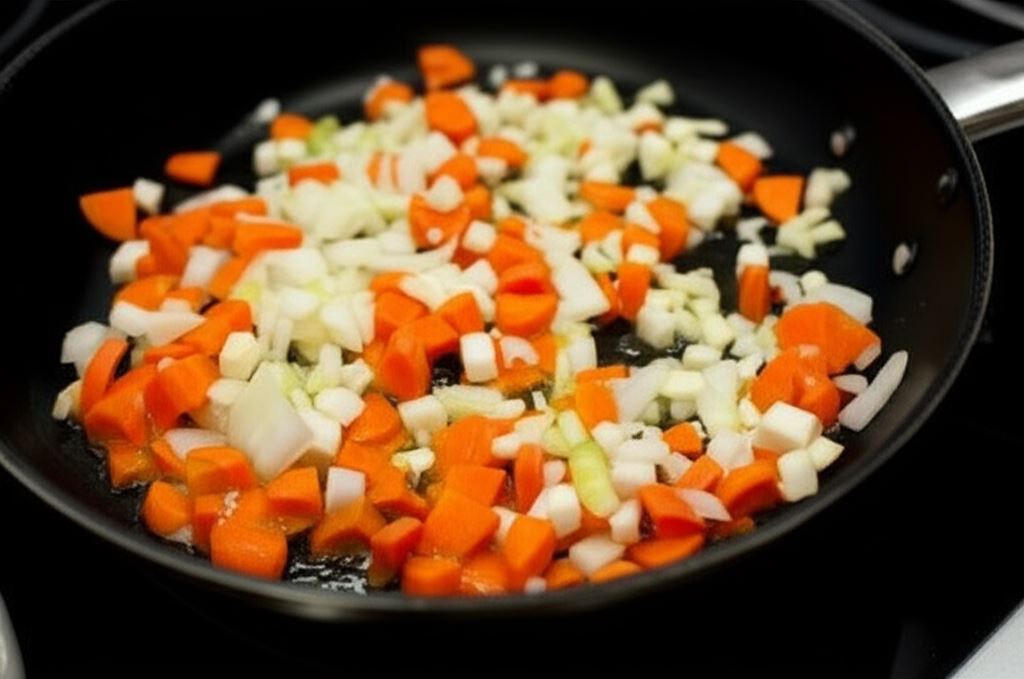 Drobno posiekaj warzywa i przysmaż je na oleju. Wlej 2 szklanki wody i gotuj przez 25 minut.