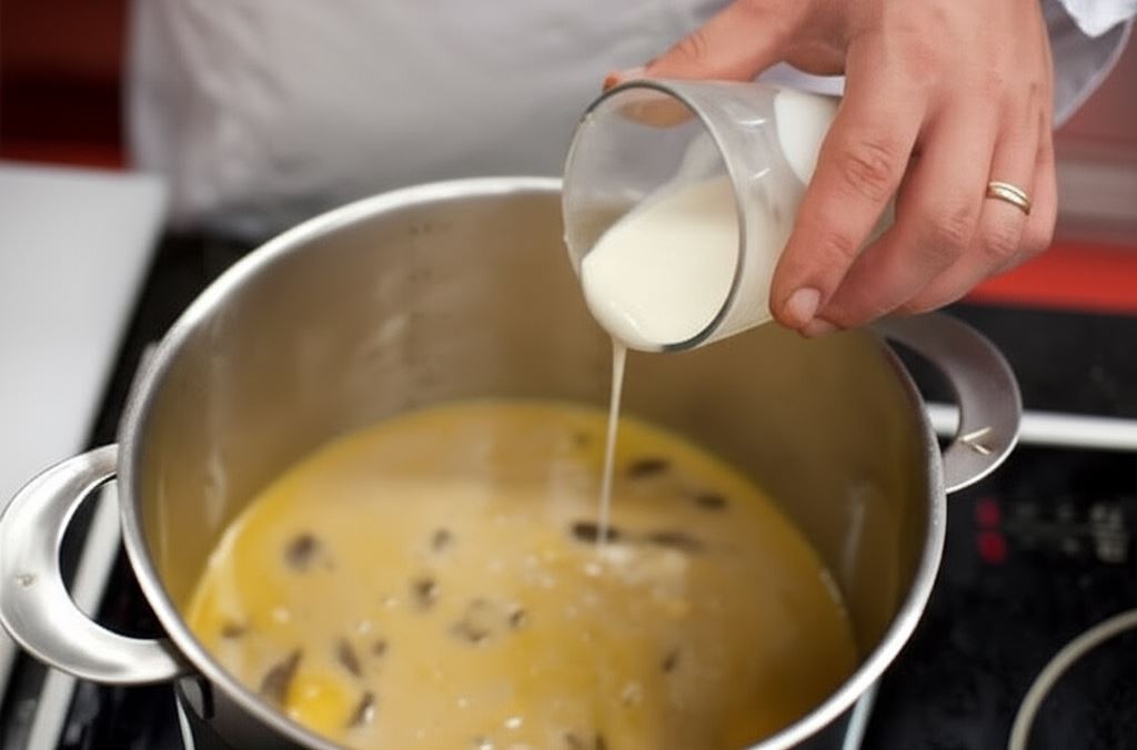 Wlej szklankę mleka i przypraw pieprzem. Zupę serwuj z makaronem.