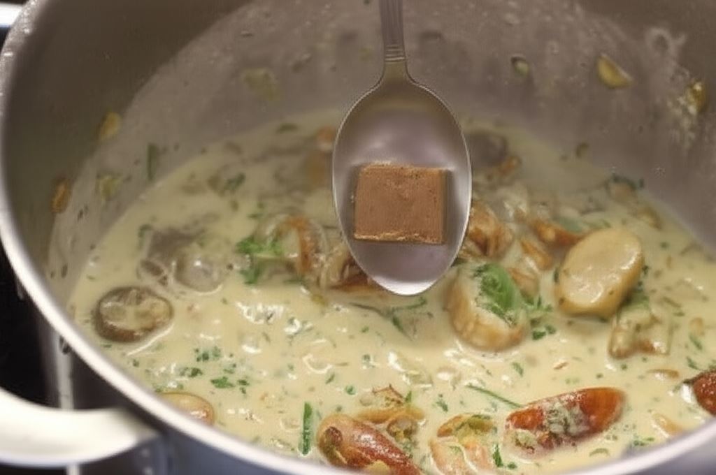 Wsyp wtedy mąkę i starannie ją wymieszaj, dolej śmietanę i gotuj przez około 5 minut, aż śmietana stanie się gęsta. Wsyp pozostałe zioła i przyprawy, włączając kostkę Knorr.