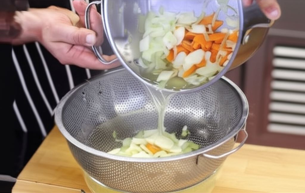 Posiekaj włoszczyznę, zalej 1,5 l wody i doprowadź do wrzenia. Po około 20 minutach odcedź warzywny wywar i przelej go do innego garnka.