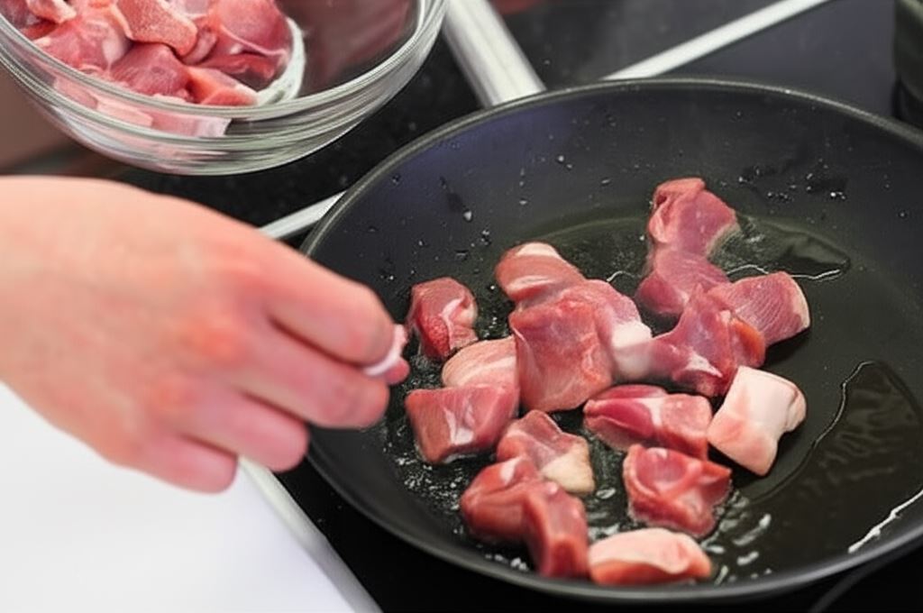 Mięso potnij w kostkę. Pieczarki na cząstki. Na patelni obsmaż mięso, aż stanie się rumiane. Potem zdejmij mięso i obsmaż pieczarki.