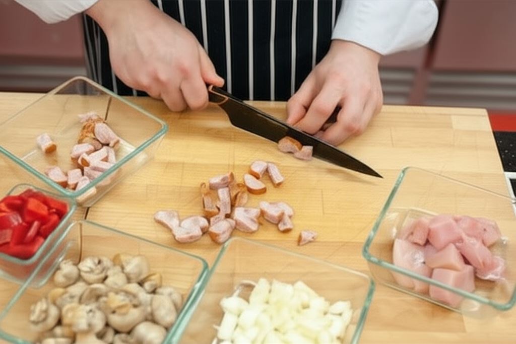 Cebulę, paprykę oraz mięso pokrój w kostkę wielkości 1,5 cm. Kiełbasę podziel na półplastry, a pieczarki przekrój na połowy.