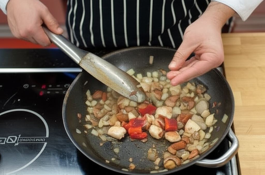 Rozgrzewający gulasz myśliwski to prawdziwa uczta dla podniebienia! Soczyste kawałki kurczaka, aromatyczna wędzona kiełbasa i słodka czerwona papryka tworzą harmonijne połączenie, które zadowoli nawet najbardziej wymagających smakoszy. Sekret tego dania tkwi w odpowiednim przygotowaniu składników – pokrojonych w równe kostki, które następnie są podsmażane na patelni, uwalniając swój intensywny aromat.