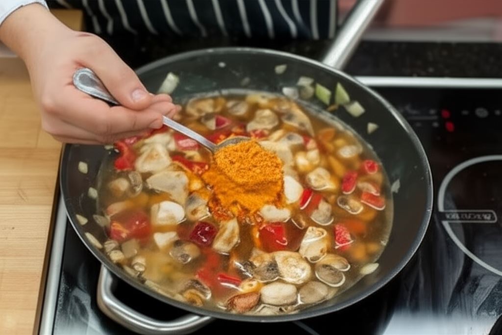 Rozpocznij smażenie od kurczaka i kiełbasy. Po chwili wsyp cebulę, pieczarki i paprykę. Smaż całość na dużym ogniu przez kolejne 2-3 minuty.