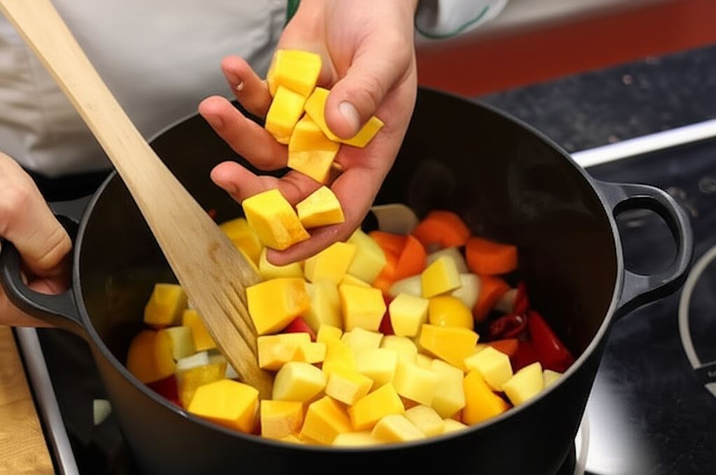 W garnku z grubym dnem zesmaż na oleju cebulę, wsyp marchewkę, paprykę i papryczkę chilli, potem ziemniaki, a na koniec dynię. Smaż mieszając przez około 5 minut.
