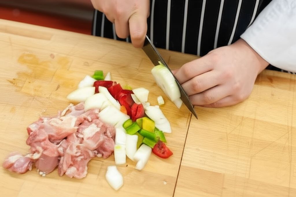 Cebulę i papryki posiekaj w kostkę o wymiarze 1,5 cm. W identyczny sposób pokrój mięso.