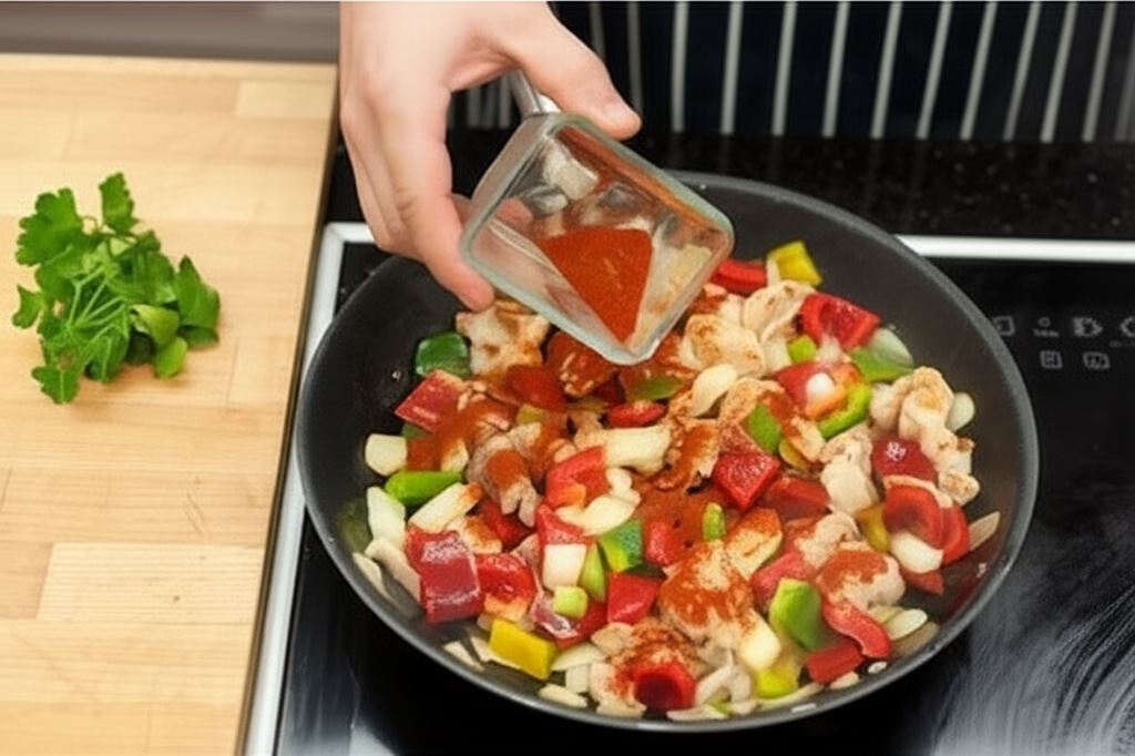 Rozpocznij smażenie kurczaka, a kiedy zrobi się rumiany, wsyp papryki, cebulę oraz paprykę mieloną. Smaż całość jeszcze przez 2-3 minuty.