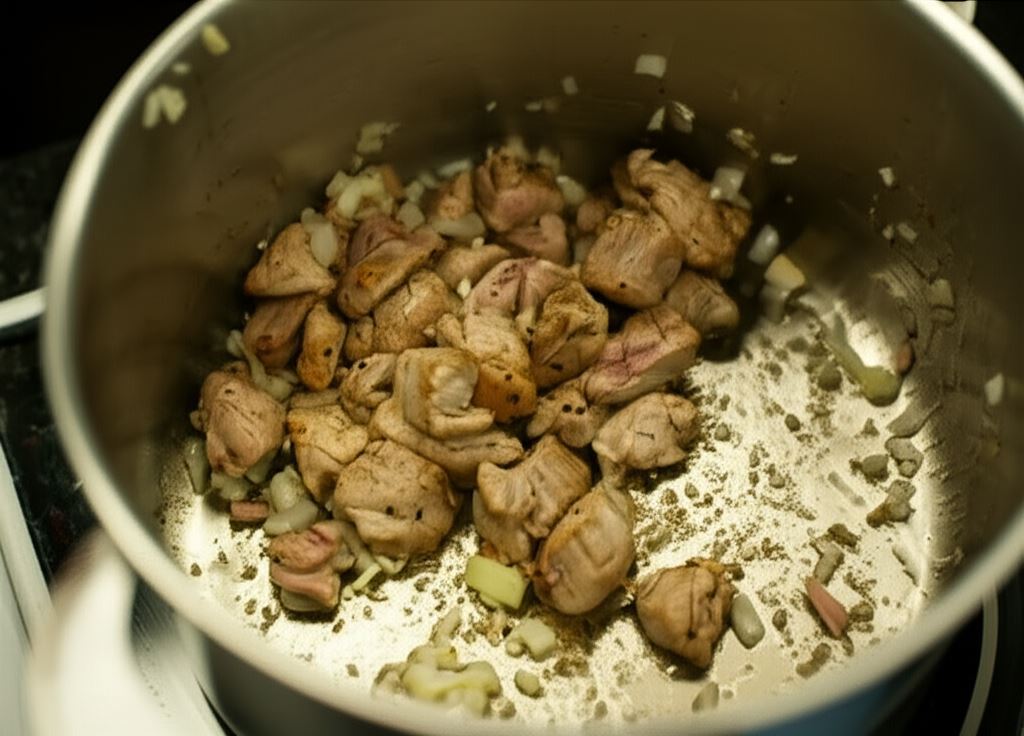 Obsmażaj kawałki mięsa na rozgrzanym tłuszczu w garnku. Smaż do momentu, aż się zarumienią. Wrzuć cebulę pokrojoną w kostkę oraz posiekany czosnek. Podsmaż wszystko jeszcze przez chwilę. Wlej 700 ml zimnej wody.