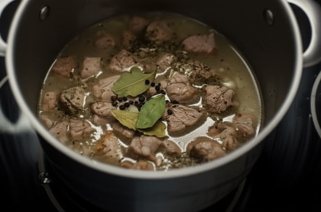 Danie doprowadź do wrzenia, usuń zebraną pianę, wsyp przyprawy (ziele angielskie, liść laurowy, ziarna pieprzu czarnego). Wszystko gotuj na małym ogniu pod lekko przykrytą pokrywką przez około 30 minut.
